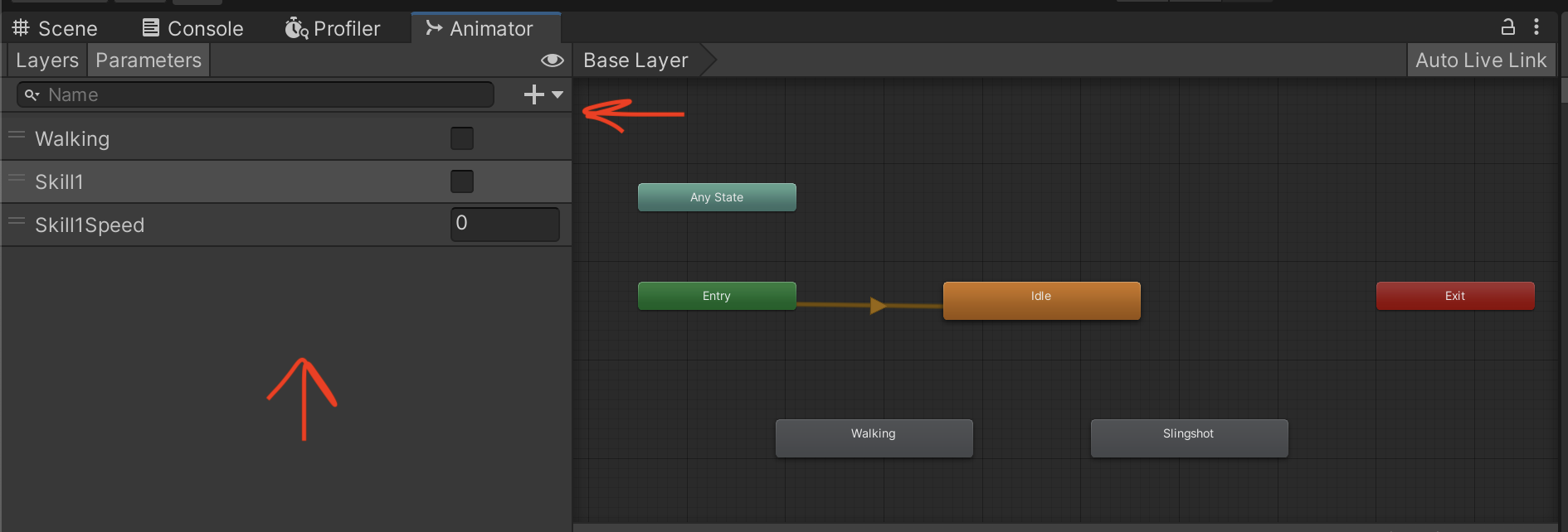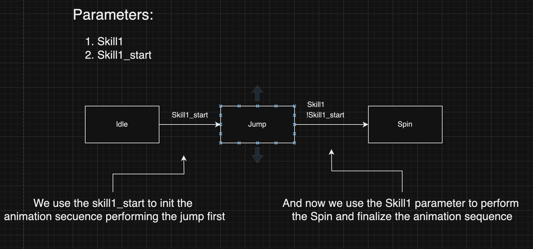 IdletoBasicSkillwhen bothwalking=falseandskill1=true.- Check other character controllers for reference.